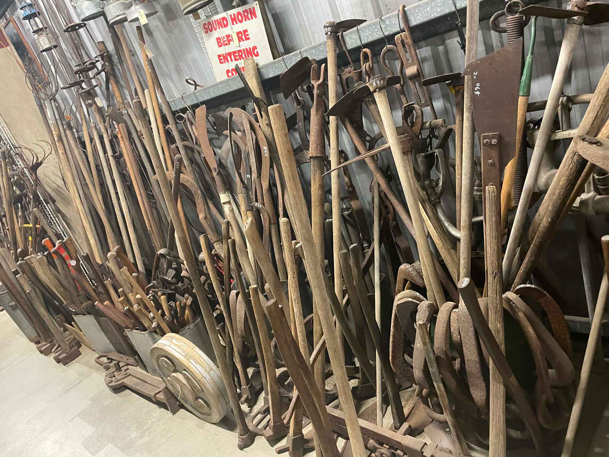 Old & antique tools, brush hooks, chain,