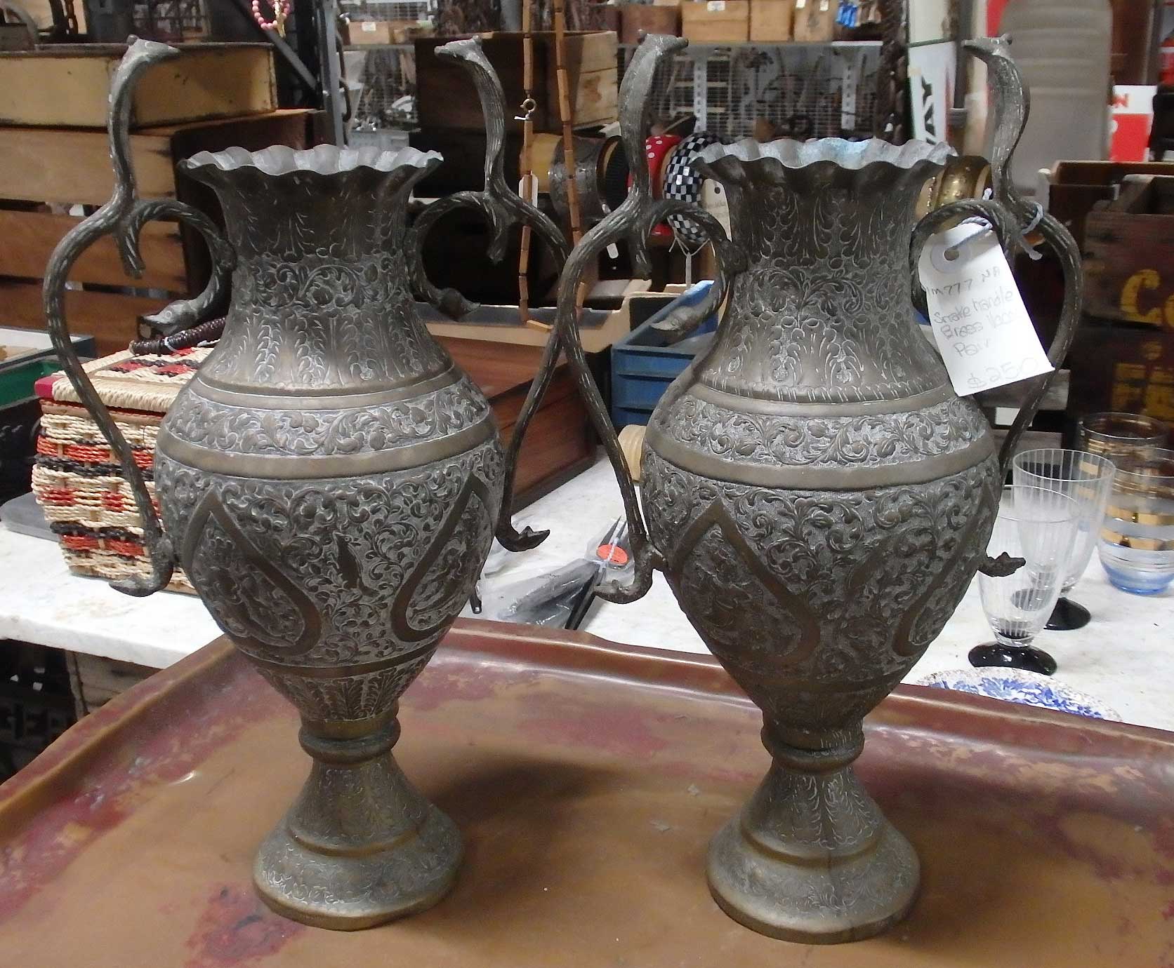 Pair heavily engraved brass vases