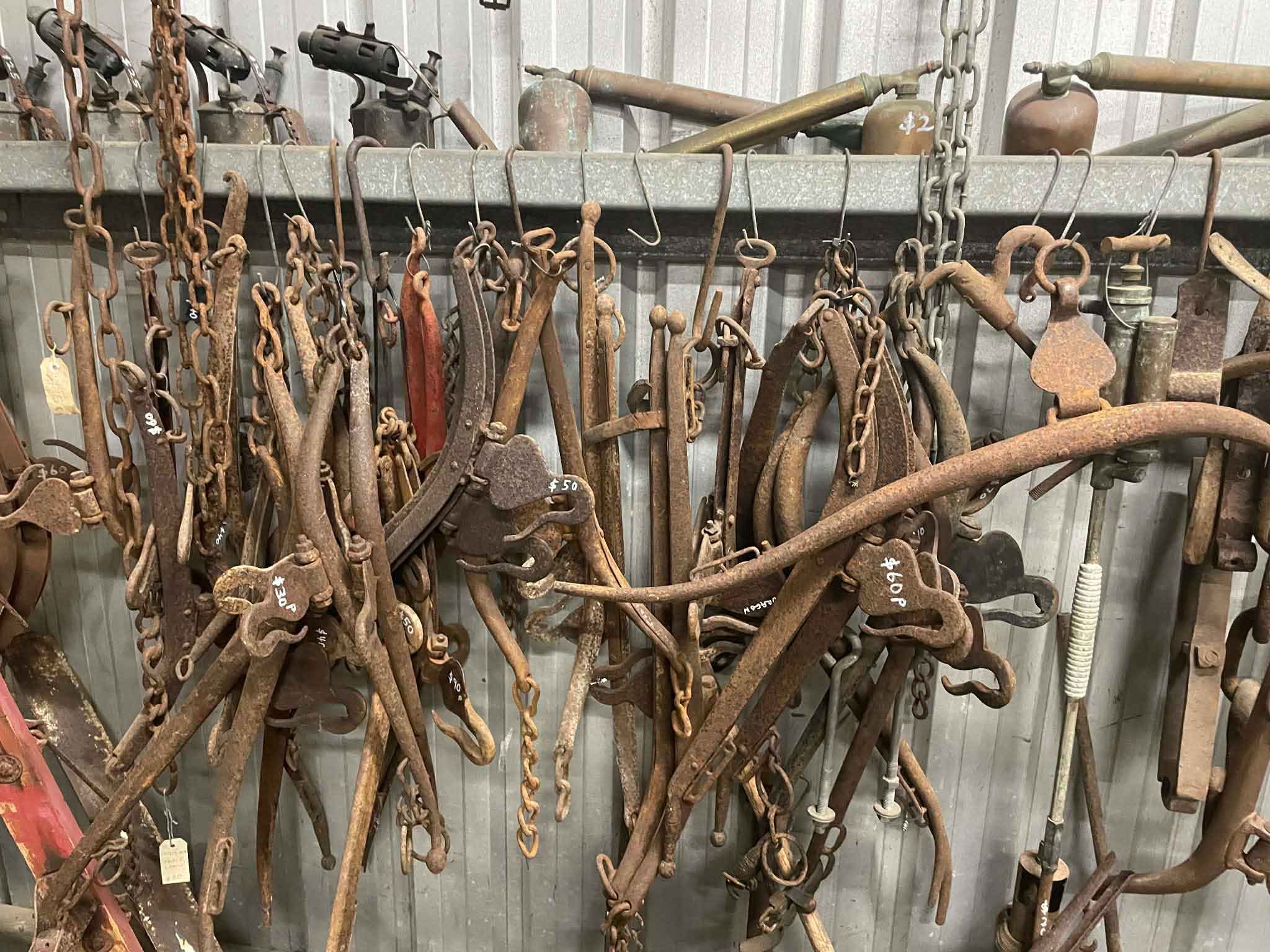 Old & antique tools, brush hooks, chain,